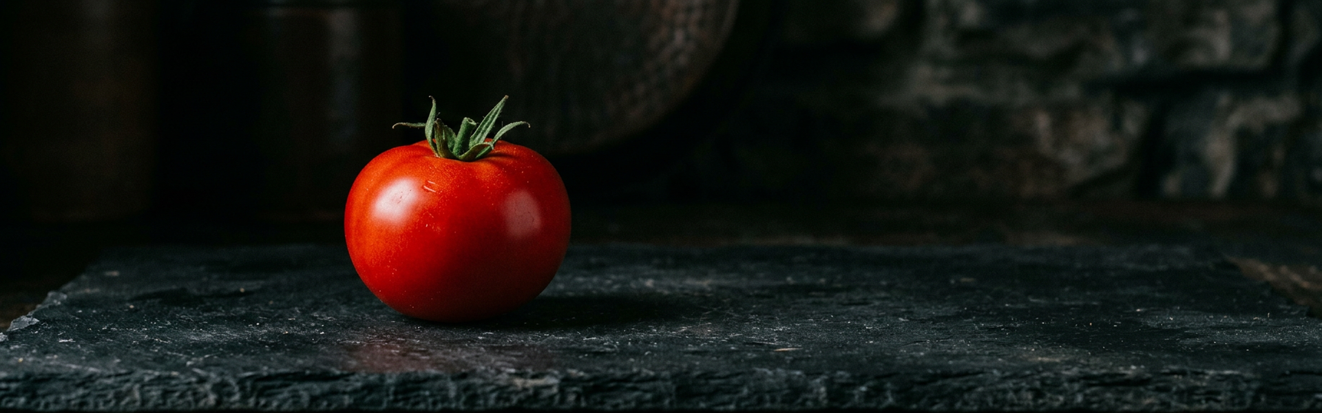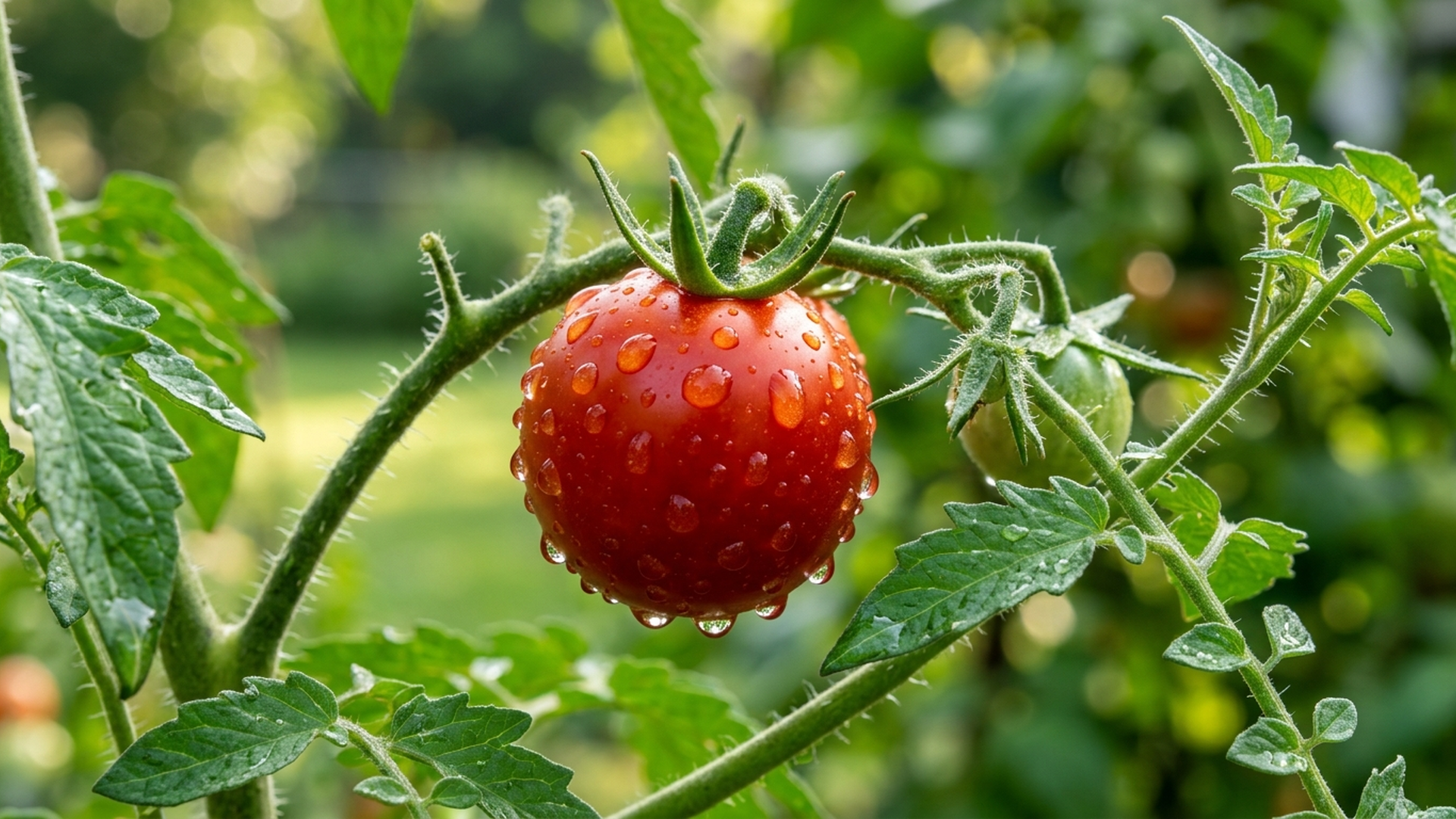 A cinematic full-bleed hero section. The background is a high-resolution macro shot of a deep red heirloom tomato still on the vine, glistening with morning dew.